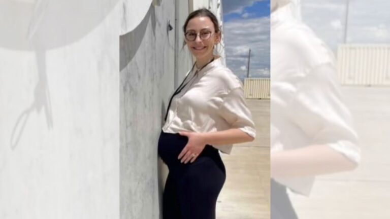 Une photo d'une femme enceinte, à un stade avancé de sa grossesse, blottie contre un site de stockage à sec...