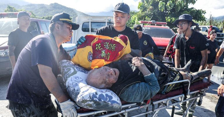 Hualien (Taïwan) - Les sauveteurs ont extrait jeudi un homme âgé de plus de 90 ans de sa maison inondée...